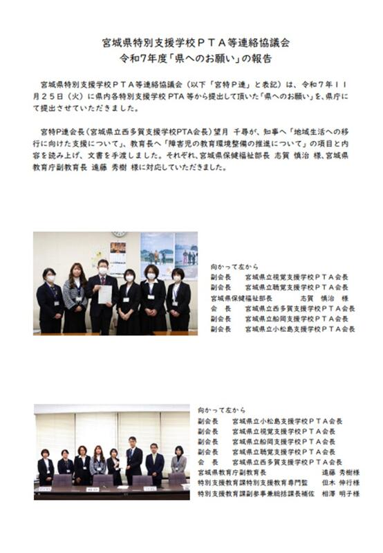 | 2024/11/07 | お知らせに、県特別支援学校PTA等連絡協議会 令和6年度「県へのお願い」の報告を掲載しました。 |